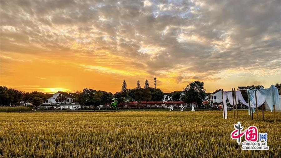 傍晚時分抵達香村,收獲了一場驚艷的落日美景,云層色彩在光線折射下不斷變化,忽而紅如火,忽而燦如金,忽而粉如煙,再到最后一抹落日的余暉撒遍整個村莊,稻田村舍,樹木小花,一切都籠罩在一片祥瑞的金光里,如夢似幻……這應是我見到過的最美江南晚霞。
