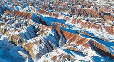 2023年12月15日,甘肅省張掖市在一場降雪之后,潔白的雪花將七彩丹霞裝扮得美輪美奐,白雪宛如輕紗浸在丹霞山上,顯得格外艷麗多彩、如夢如幻。雪后放晴,鏡頭下的甘肅張掖七彩丹霞景區被雪色覆蓋,顯現出“雪浴丹霞”景觀。殷旭攝(人民圖片網)