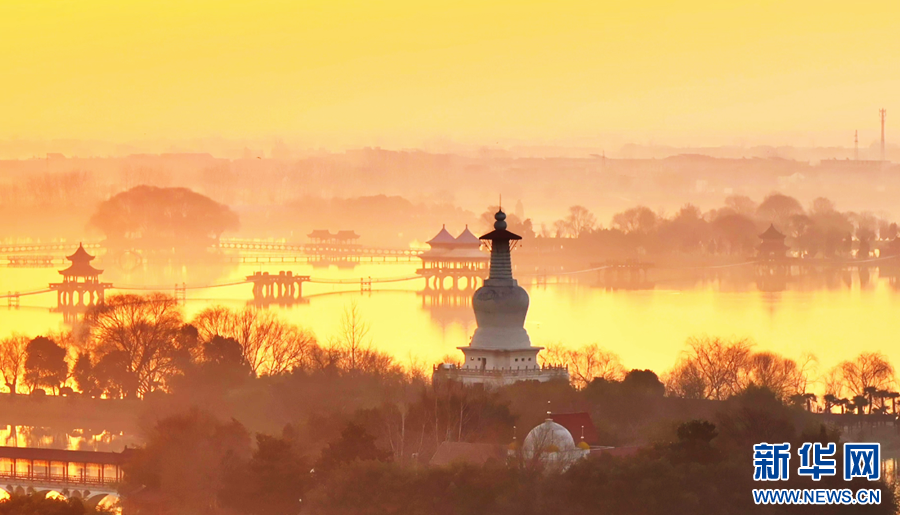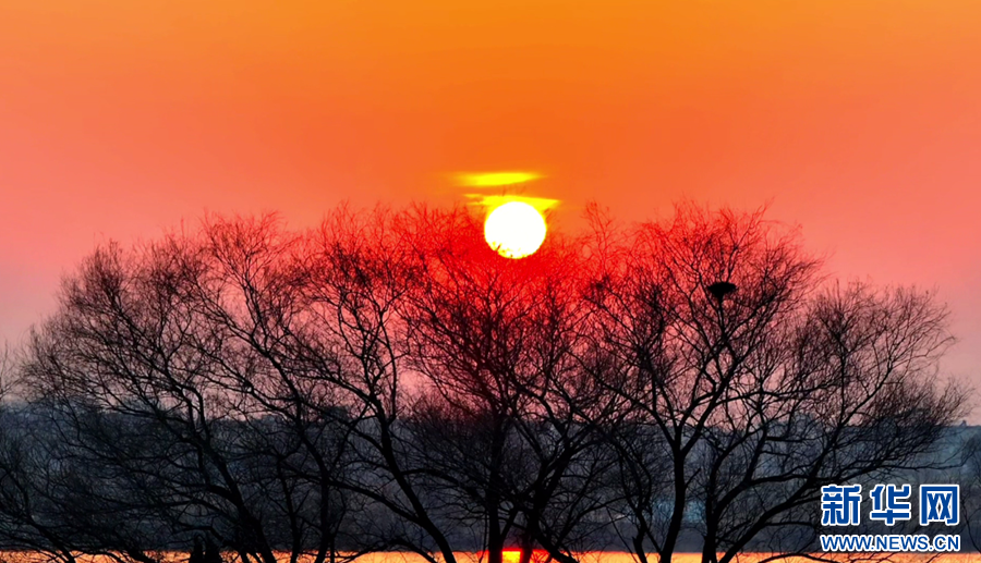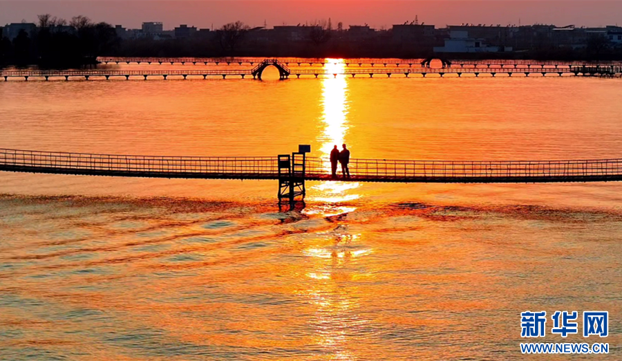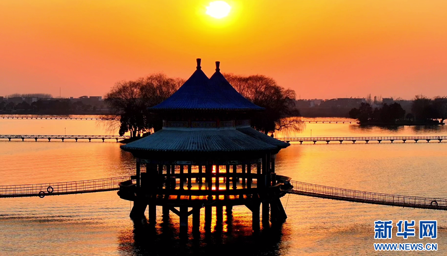 近日,在安徽省潁上縣八里河風景區,隨著紅日冉冉升起,晨曦映照在水面上,水光瀲滟,交相輝映,宛如油畫一般,盡顯光影之美。新華網發(徐紅梅 攝)