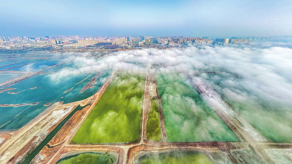 3月11日,因連日來天氣晴好,晝夜溫差大,運城市中心城區和鹽池上空出現平流霧景觀,七彩的鹽池在霧氣下若隱若現,形成一幅無與倫比的美麗畫卷。據了解,平流霧是沿海暖濕空氣水平流經寒冷地面或水面時,導致下部冷卻而形成的云霧。