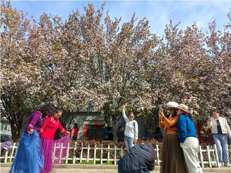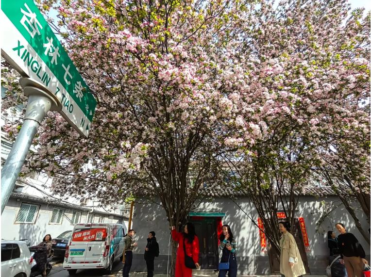 “一朵海棠露春芳,一樹海棠春滿堂?!薄斑@個路牌也太春天了吧,趁著春光明媚,帶上相機來打卡吧。”“這幾天,這里成了最浪漫的打卡地,喜歡拍照的,趕快去吧!”杏林七條海棠花綻放,從去年海棠盛開時就火爆出圈,幾十米長的小巷總能看到游人如織的場景,這處隱匿在鬧市中的花海如此熱鬧,許多市民都是看到短視頻后慕名而來,希望與這片美麗花海來一次親密接觸。