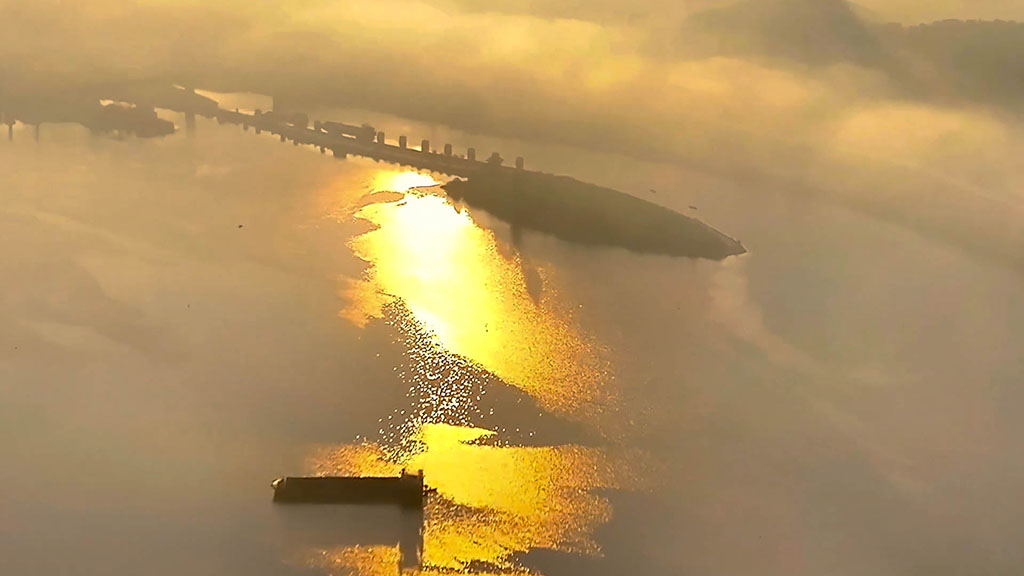 連綿的山巒、氤氳的湖泊,散居的村落、蔥郁的林木,在薄霧籠罩下,西津湖宛如一幅流動的水墨畫。