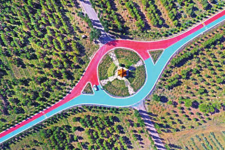 在得勝堡不遠處,長城一號旅游公路蜿蜒而過。車行其上,仿佛置身于絢爛的畫卷之中,紅藍黃交織的道路色彩鮮艷;環顧四周,云海翻騰。長城驛站為游客提供休憩之所,路旁是遼闊的綠丘和連綿的樹林。