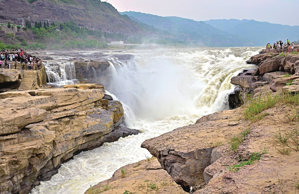 7月2日,游客在吉縣黃河壺口瀑布景區游覽觀瀑。近日,黃河進入主汛期,受上游降雨增多和水庫調節放水影響,黃河壺口瀑布水量大增,吸引了眾多游客。