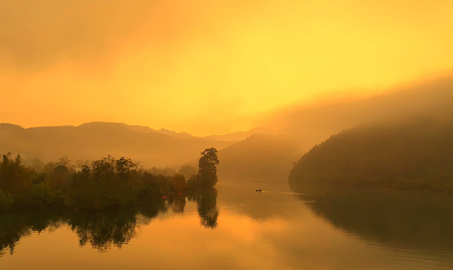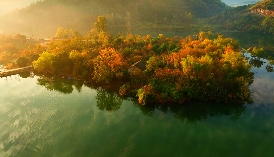10月29日,在安徽省池州市的秋浦河畔,朝霞與水面相映成趣,泛舟秋浦河仿佛置身仙境。秋浦河是長江支流,風光秀美,因唐代詩人李白的《秋浦歌十七首》等詩作而聞名。新華網發(王帆 攝)