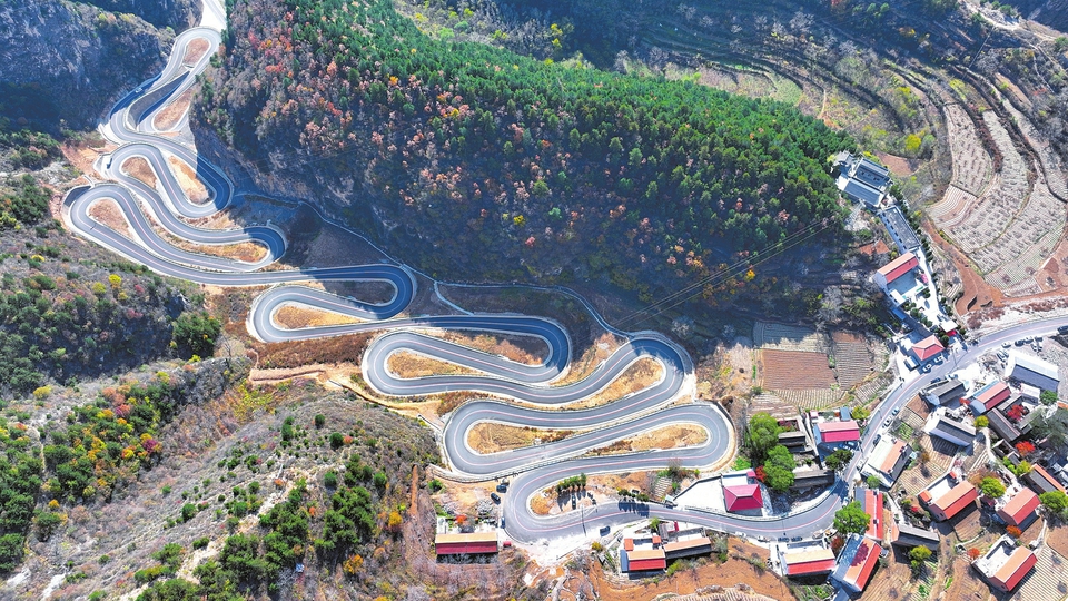 10月29日拍攝的太行一號旅游公路壺關縣東柏坡段,宛如巨龍盤踞在五彩斑斕的群山間。該路段連通了太行山大峽谷5A級風景區等眾多景區、景點和古村落,也因奇險峻美成為網紅打卡地,成為當地文旅康養產業的快速路、致富路。