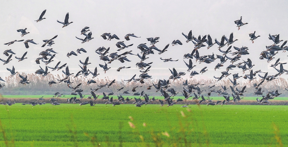 11月24日,國家二級保護動物豆雁在臨猗縣黃河濕地飛翔,給冬季的濕地注入了生機與活力。近年來,當?shù)夭粩嗉哟簏S河流域生態(tài)保護力度,對野生鳥類開展“護飛行動”,黃河濕地生態(tài)環(huán)境越來越好,來此越冬的鳥類數(shù)量和種類逐年增加。