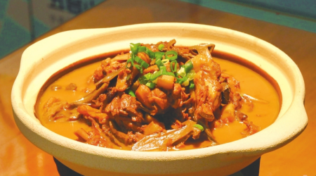 制作過程處處是講究,先泡發臺蘑、處理雞塊,用十幾種調料煸炒雞塊,再與泡發好的臺蘑小火慢燉40分鐘,讓山珍的鮮味與雞肉的醇香充分融合,最后大火收汁。這道菜將臺蘑鮮香與雞肉醇厚完美平衡,湯汁濃郁不膩。