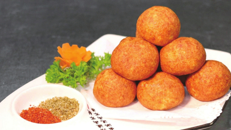 豆腐丸子精選五臺山鹵水豆腐,擠出多余水分,壓成細膩豆腐碎,加入佐料攪拌,揉成圓潤緊實的丸子,蒸制后在麥芽糖水中定型再開炸,外衣漸鍍“金甲”,內里卻保持著豆腐的柔嫩本味。