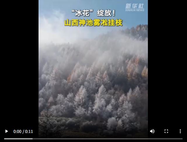初冬時節,山西神池國家登山步道出現霧凇景觀。金色的樹枝上掛滿冰晶,微風徐來,霧凇輕盈搖曳,還有牛羊在山坡上悠閑地吃草。霧凇宛如一層白色的薄紗,將整個森林籠罩其間,如夢如幻。