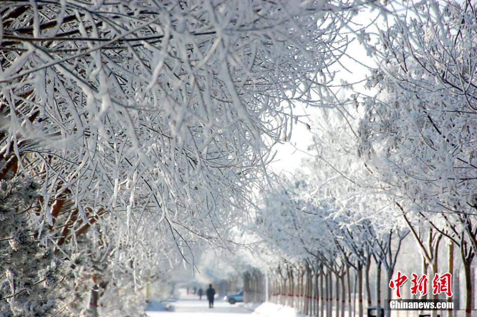 受寒潮低溫的影響,甘肅省玉門市城鄉近期普降中到大雪,寒流使這里大片的樹木上形成美麗的霧凇,十分壯觀,吸引眾多市民走出戶外欣賞美麗的霧凇美景。萬宗平 攝