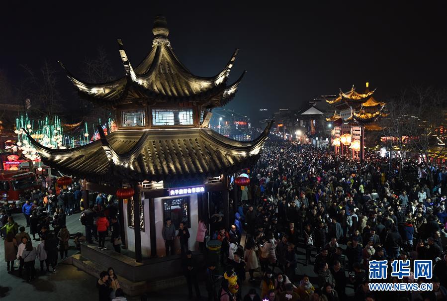 2月22日晚,游人在夫子廟景區觀燈游玩。當晚,在江蘇南京夫子廟秦淮風光帶舉辦的秦淮燈會彩燈齊放,人們前來觀燈鬧元宵。 新華社記者孫參攝