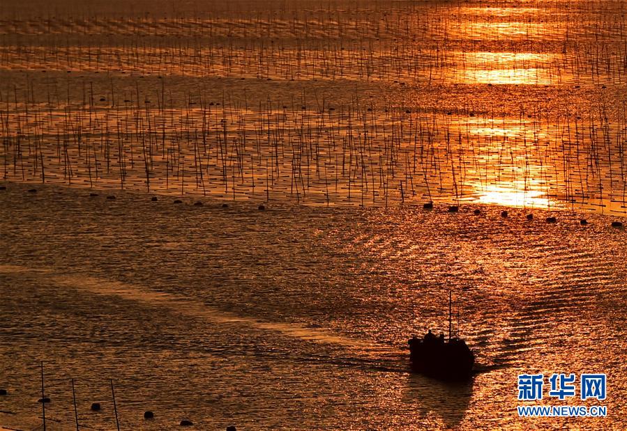 12月9日,夕陽西下,一艘漁船穿行在海上紫菜養殖架間。福建省寧德市的霞浦縣以美麗的淺海、灘涂聞名,豐富的旅游資源和人文資源一直是攝影師追逐的靈感所在。 新華社記者魏培全攝
