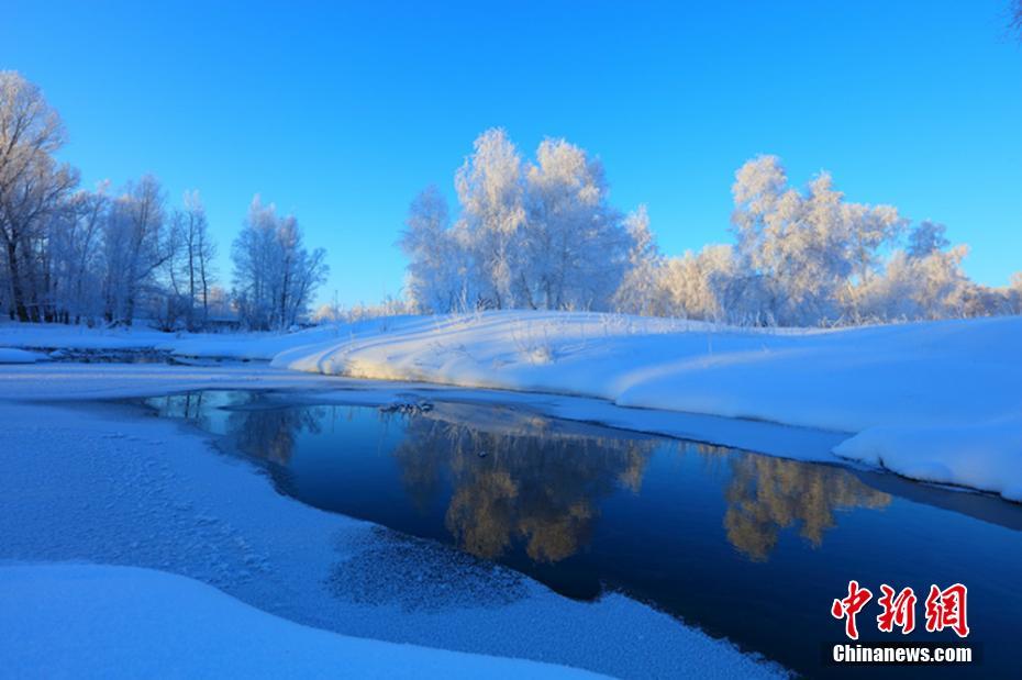 連日來,新疆北部持續低溫,哈巴河縣受寒冷天氣的影響,出現了大面積霜掛美景。一棵棵白樺樹被妝點成銀白色,晶瑩剔透,潔白無瑕,置身其中,如同進入夢幻世界一般。圖為清晨的哈巴河縣銀裝素裹,云霧繚繞。 劉是何 攝