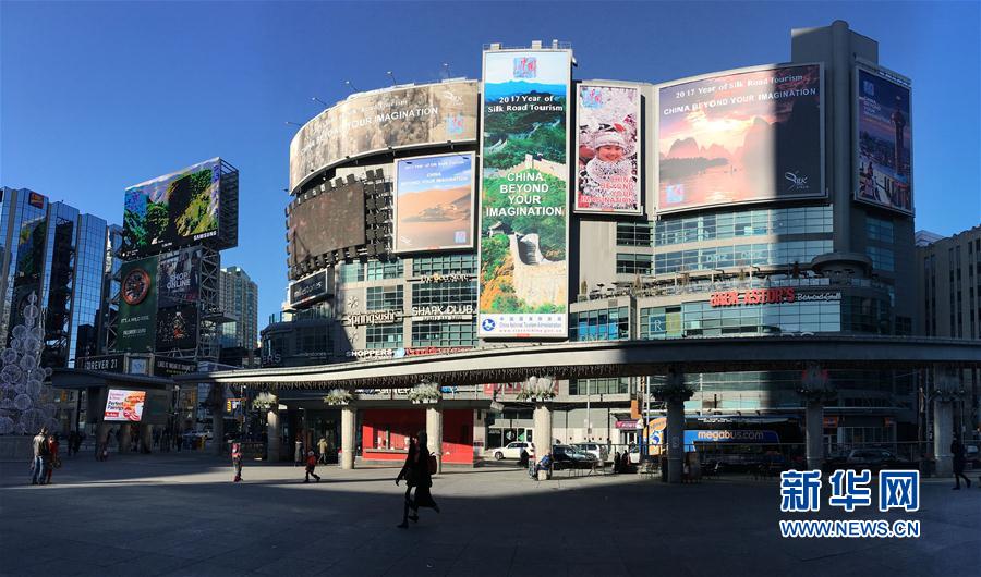 這是1月1日在加拿大多倫多市中心的鄧達斯廣場拍攝的“美麗中國——2017絲綢之路旅游年”主題宣傳廣告牌。從2016年12月26日起,由中國國家旅游局推出、以“美麗中國——2017絲綢之路旅游年”為主題的大型旅游宣傳廣告在加拿大多倫多市中心鄧達斯廣場亮相,向人們展示中國美麗而豐富的旅游資源。整個活動將持續5周。新華社發(鄒崢攝)