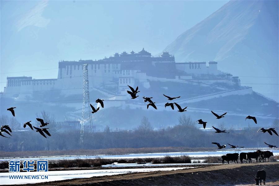 水鳥飛翔在拉魯濕地上空(1月7日攝)。入冬以來,位于拉薩城邊的拉魯濕地國家級自然保護區候鳥增多,斑頭雁、赤麻鴨、野鴨等數十種候鳥在這里過冬。拉魯濕地國家級自然保護區海拔3600多米,總面積12.64平方公里,是中國海拔最高、面積最大的城市天然濕地,被譽為“拉薩之肺”。新華社記者 張汝鋒 攝