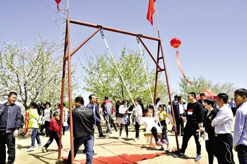 4月23日,為了進一步鞏固脫貧成效,提升鄉村旅游品牌效應,展示當地特色農產品和黃土高原的風土人情,保德縣楊家灣鎮段家溝村隆重舉辦了首屆美麗鄉村賞花攝影節。圖為前來賞花的游客正在蕩秋千。(劉澤宇 攝)