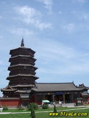 應縣木塔佛宮寺釋迦塔位于山西省應縣城內西北佛宮寺內。俗稱應縣木塔。塔總高67.31米,是我國現存時代最早的木結構高層建筑.佛宮寺釋迦塔建于后晉天福年間,遼清寧二年(1056年)重修。 木塔建造在高大臺基上,臺基高4米余,分上下兩層。上層的臺基和月臺各角,都有角石,從角石上突起的獅子來看,雕刻風格古樸,應是遼代的貴物。木塔總高67.31米,其中塔剎高約10米。塔平面八角形,底層直徑30.27米。塔有五個明層,各層間又夾有暗層,實為九層。底層為重檐并有回廊,故塔的外觀為六層屋檐。塔的整體比例適當,其外形也顯得穩重而莊嚴。