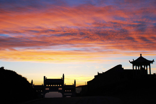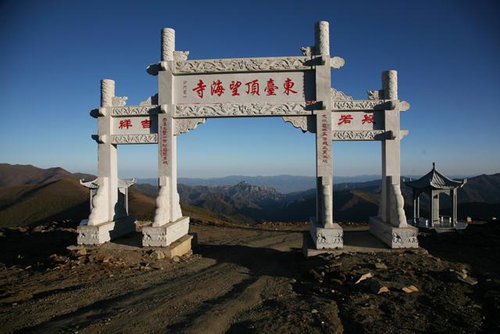 望海峰的盛景在于東觀日出。由于東面再無大山阻擋,所以人的目力可東眺非常遙遠(yuǎn)的地方。峰頂曾建有望海樓,專門為觀景而建。可惜年久已毀,1985年重建,為望海寺,內(nèi)供聰明文殊。有史籍記載日出之壯麗景象:“每當(dāng)蒸云寢壑之隙,爽氣澄秋之際,于日出扶桑之時(shí),可望紅日十倍于車輪,紅輪之下,隱隱水光閃爍,若波若鏡,瑰麗非凡。1977年8月,趙樸初先生登東臺觀日出后乘興填詞《五臺雜詠·調(diào)寄憶江南》,形象描繪了東臺日出之勝景: