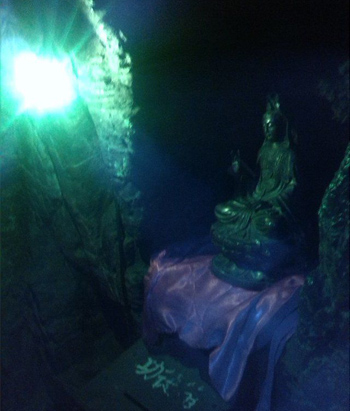 千佛洞,分內外兩洞,外洞大而明,內洞小而幽,中間有一個扁圓形孔穴相通。內洞中,可以容納五至七人。內洞的洞壁上,山巖經水溶化,產生許多乳石及石筍,夾有各種色質,猶如人體心肝五臟,洞形又呈葫蘆形狀,后人便稱之為母腹。佛教宣揚進入小洞就是投胎佛母,受其恩育,復出小洞就是洗掉人生一切煩惱,獲得無上歡樂幸福。