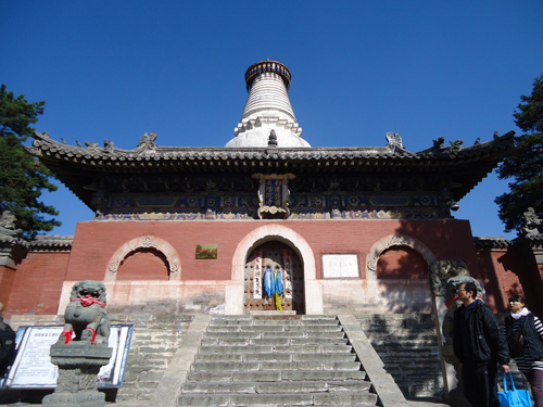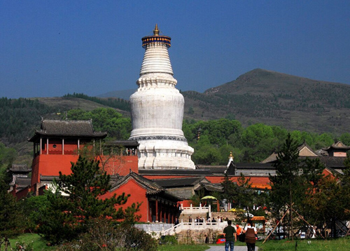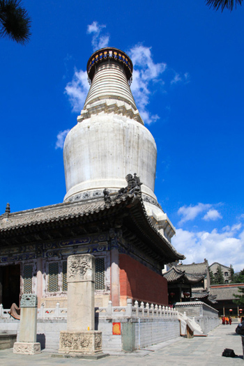 塔全稱為釋迦牟尼舍利塔,俗稱大白塔。塔身撥地而起凌空高聳,在五臺山群寺簇擁之下頗為壯觀,人們把它做為五臺山的標志。此塔通高七十五點三米,環周八十三點三米。塔基為正方形,塔身狀如藻瓶,粗細相間,方圓搭配,造型優美。塔頂蓋銅板八塊成圓形,按乾、坎、艮、震、巽、離、坤、兌等八卦地位安置。塔頂中裝銅頂一枚,高約五米,覆盤二十一米多,飾有垂檐三十六塊,長兩米多;每塊垂檐底端掛風鐘三個,連同塔腰風鐘在內,全塔共有二百五十二個。風歡鈴動,叮鐺作響。