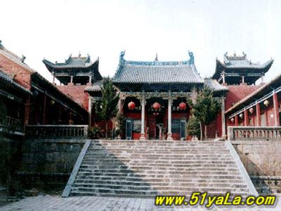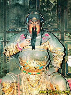 前行有午門.是一座面闊五間,單檐廡殿頂、石雕回廊的廳式建筑。周圍有石欄桿,欄板正反兩面浮雕各類圖案、人物144幅,洋洋大觀,頗有童趣。廳內南有周倉、廖化畫像,軒昂威武。北面左右兩側,彩繪著關羽戎馬一生的主要經歷,起于桃園三結義,止于水淹七軍,只是沒有走麥城這個情節,在全國關廟壁畫中都按此進行,據說這是因忌諱關羽自高自大而被殺,終于造成蜀國的覆滅而隱去的。穿過午門,經“山海鐘靈”坊、御書樓,便是關帝廟主體建筑崇寧殿。