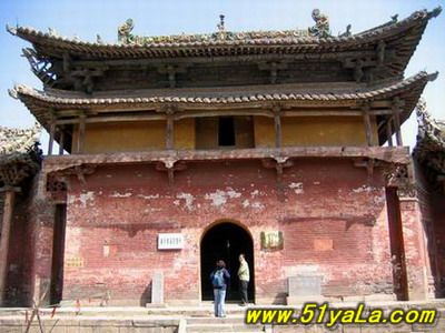 山門最古,為金時原構,五開間,兩層,下層磚砌高臺,中柱上裝青石門框及板門,門框上線刻花紋,圖案秀美。上層施平座及勾欄,粱架現整簡潔,結構已具元代爬梁的雛形。屋頂琉璃為明代補制,鮮麗勁秀。這種高臺以上的門廡或殿宇,見宇敦煌壁畫,實物中少有。