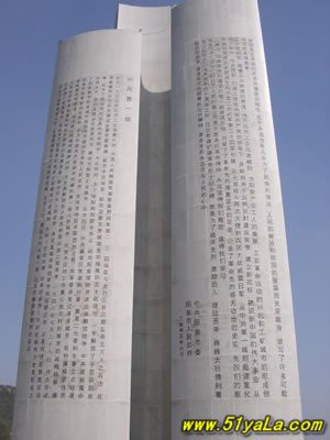 高40公尺的主碑 ,形如一把鋒利的刺刀 。主碑的三個面上,分別鐫刻著彭真、徐向前、薄一波的題詞。彭真的題詞是“戰績輝煌,永垂史冊”;徐向前的題詞是“參加百團大戰的烈士們永垂不朽”;薄—波的題詞是“百團大戰,抗日戰爭中最光輝的一頁,必將載諸史冊,永放光芒。”