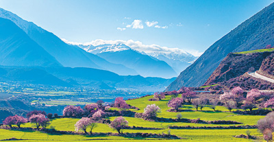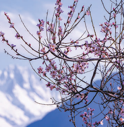 盛開的桃花與遠處的雪山相映成景。 圖為本報記者徐馭堯攝