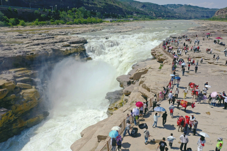 6月28日,游客在吉縣黃河壺口瀑布景區(qū)游覽觀瀑。仲夏時(shí)節(jié),隨著上游降雨增多,位于晉陜兩省交界的黃河壺口瀑布水量明顯增大,滾滾而來的黃河水如萬(wàn)馬奔騰,氣勢(shì)磅礴,吸引來眾多游客。