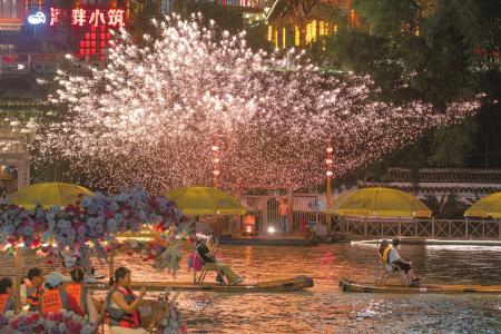 7月9日,游客乘坐“龍游貢水”竹筏在貢水河上觀賞打鐵花表演。位于湖北省恩施土家族苗族自治州的宣恩縣城是一座“景城一體·主客共享”的國家4A級景區。近年來,當地不斷推陳出新的“龍游貢水”竹筏、烏篷船等體驗和觀賞項目,讓游客在璀璨燈火中沉浸式感受山區小城的夜色魅力。