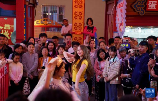7月31日,在新疆伊犁哈薩克自治州特克斯縣八卦城的“八卦城之夜”市集,游客在欣賞民族舞蹈表演。