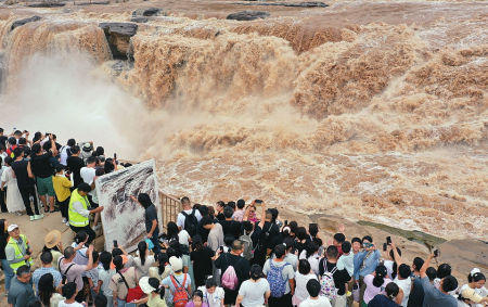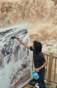 8月10日,一名畫家在吉縣黃河壺口瀑布景區現場創作(左圖)。連日來,吉縣黃河壺口瀑布水量持續增大,形成壯美瀑布群景觀,奔騰咆哮的雄姿吸引了眾多書畫愛好者前來創作。