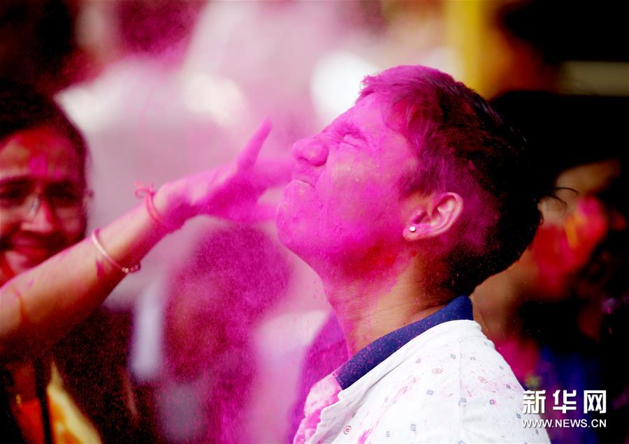 胡里節也叫“灑紅節”,人們在自己臉上和身上涂上顏料,還向別人拋撒五顏六色的顏料和粉末,迎接春天的到來。新華社發(吳昂 攝)
