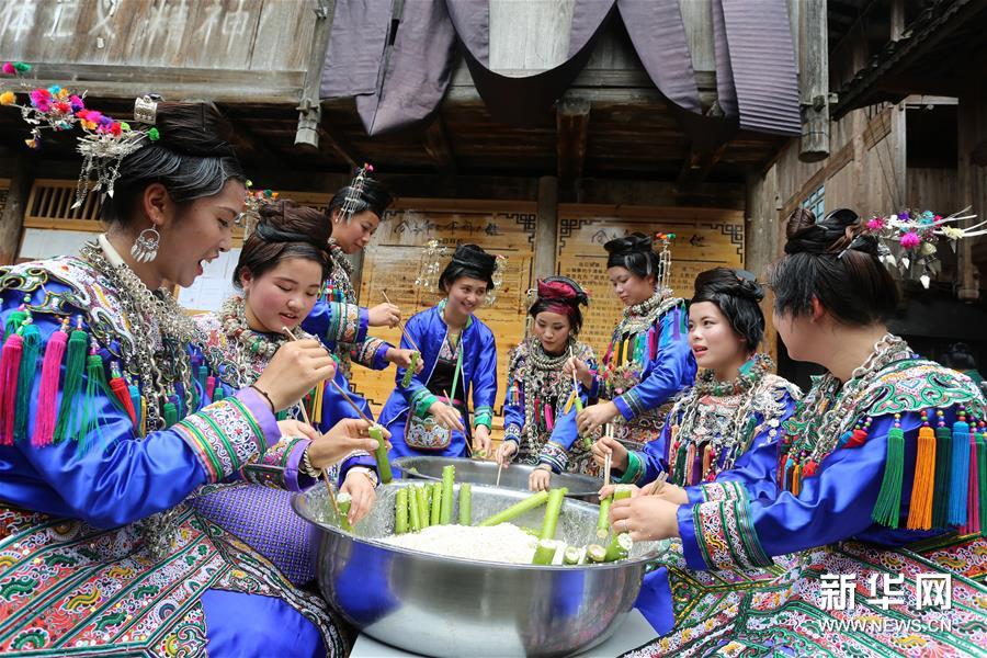 5月3日,貴州省首批魅力侗寨——榕江縣烏公侗寨歡度傳統的竹米節,重溫侗民遠古農耕風情。竹米節也叫吃竹筍飯,在每年谷雨至立夏期間竹筍生長的時候,侗族群眾采摘斑竹筍,把糯米灌進筍筒煮熟食用。這樣既能保持米飯的原味,又有竹筍的清香,并且還方便攜帶至坡上田間地頭食用。久而久之,侗族人每到春夏之交的農耕時節都會過竹米節,殺豬宰羊祭祀侗族祖先,唱歌跳舞祈求五谷豐登。新華社發(楊成利 攝)
