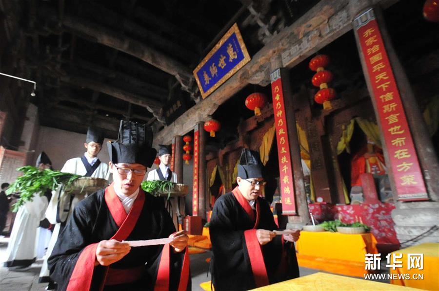 5月7日,山西運城新絳縣在當地千年古城絳州的文廟首次舉行釋菜禮大典,以弘揚傳承尊師古文明,吸引了城鄉眾多群眾和中小學生冒雨觀典。新華社發(高新生 攝)