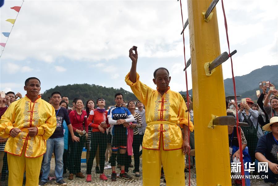 農(nóng)歷十月十五前后,福建西部武平縣各山村陸續(xù)進入農(nóng)閑時節(jié)。按照當?shù)仫L俗,不同村子各自擇日舉辦民間活動,其中較有代表性的就是“上刀山”絕技。“上刀山”絕技在閩西山村流傳已有數(shù)百年歷史,表演者需光腳順著磨得鋒利閃亮的36把鋼刀,攀登至8米高的杉木柱子頂部,接受長者祝福,祈求風調(diào)雨順、五谷豐登。新華社記者 宋為偉 攝
