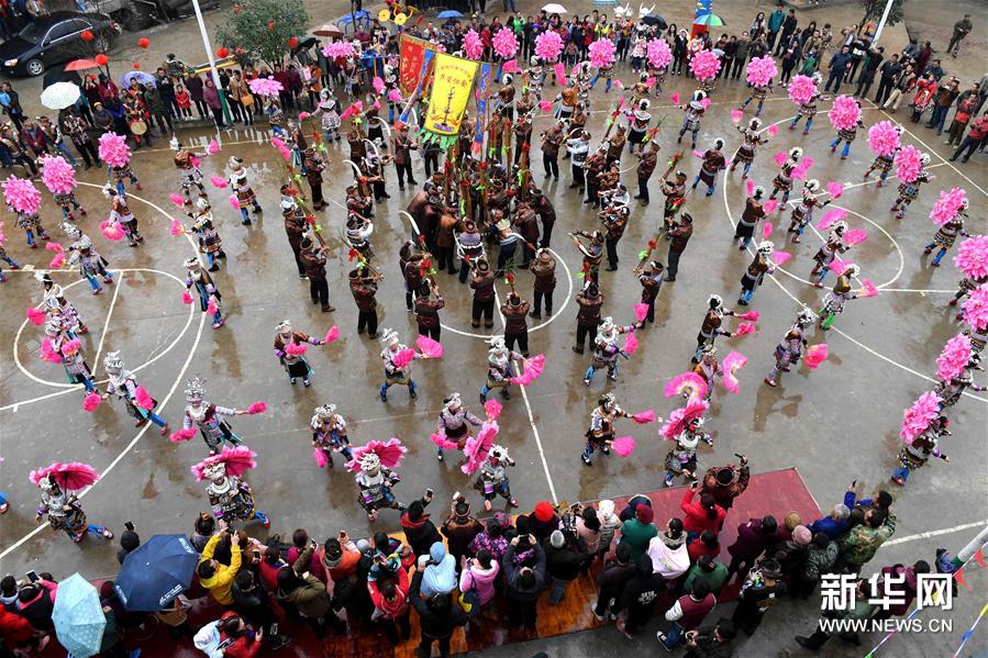 2月7日,廣西融水苗族自治縣安太鄉苗族群眾開展傳統的“打同年”民俗活動。當地數百名苗族同胞與游客們歡聚一堂,一起開展對歌、蘆笙踩堂、文藝晚會等活動,歡慶新春佳節。 “打同年”是融水苗族村寨的一種民俗,即友好村寨之間的拜年聯歡活動。新華社記者 李斌 攝