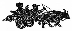 《姥爺送外甥》是靜樂民間老剪紙藝術家辛芙英早年的一幅剪紙,也是靜樂剪紙最具代表性的一幅名作,現收藏于中國美術館。這幅剪紙表現了閨女住完娘家之后,由父親(外甥的姥爺)趕著牛車送閨女和外甥回家的場面。剪紙人物造型生動形象,樂趣橫生,令人百看不厭。