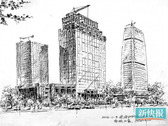 “以前工作日需要上班,我就利用周末在街巷間走動,看到地標建筑就開始畫。遇到正在施工的高樓,我就計算著日子,到高樓即將封頂的時候,我就帶上紙筆到施工現場畫畫。”吳立中介紹。
