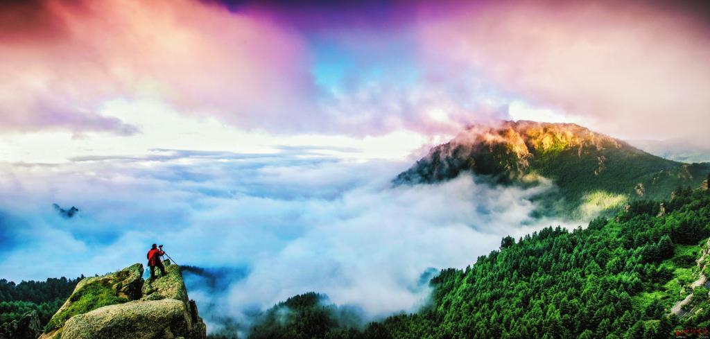 看蘆芽日出,自然需要天氣晴好。太陽即將出來之時,東方天際逐漸由灰白變為乳白,紅霞照映,彩帶飄飄。突然,一道亮光噴射而出,為剛剛還處于昏暗中的遠近峰尖涂上一層金色,亮閃閃的峰尖宛若利劍直插云天。隨后,一輪紅日在東方的云海里冉冉升起,狀如火球,色如朱紅,蓬勃向上。環顧周邊,大小山峰披上紫紅的外衣,漫天云霧頓時被染成橙紅色,格外漂亮!云霧一會兒似玉帶,纏繞在山腰;一會兒似流云,從山頭傾瀉而下;一會兒似海浪,奔騰洶涌。蘆芽山日出時分的云霧,一點都不比黃山遜色。