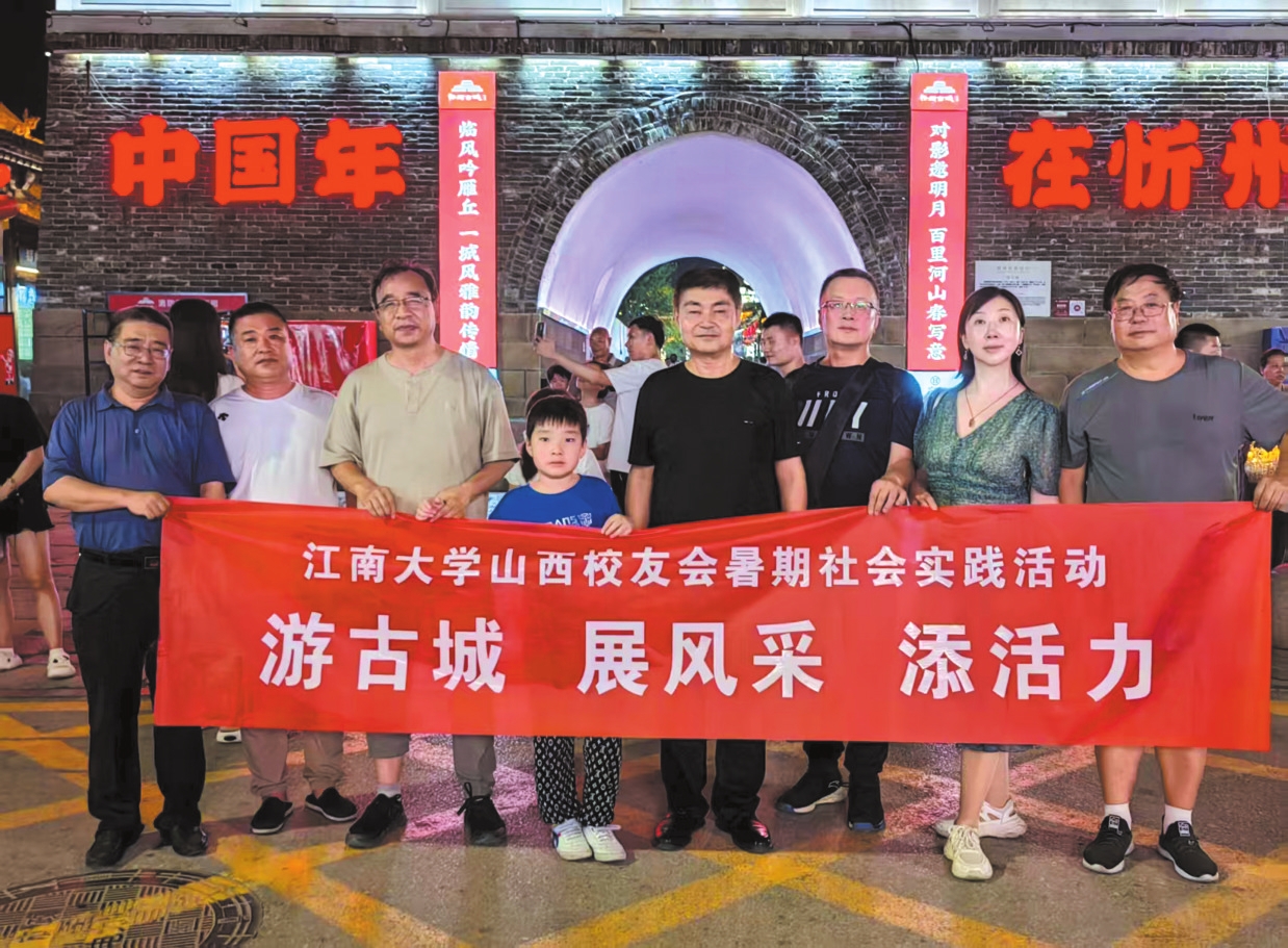 夏日的傍晚,落日熔金,忻州古城城樓如剪影般佇立,與暮色深沉交融。校友們沿著石板路緩緩前行,沿街仿古建筑的恢宏氣勢(shì)深深地吸引著大家。夜幕下的古樓在彩燈的映照下更顯雄偉,校友們撐起“游古城展風(fēng)采添活力”的紅色會(huì)標(biāo)合影留念,鏡頭記錄下了我們相聚的寶貴瞬間。