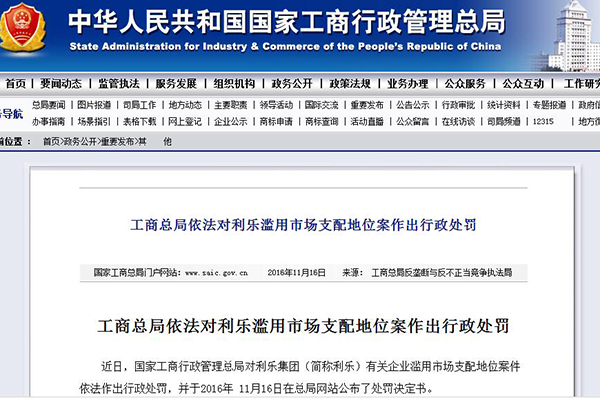 新華網北京11月16日電(記者婁奕娟)11月16日,國家工商行政管理總局官網發布處罰決定書稱,2009-2013年期間利樂集團(簡稱利樂)有關企業濫用市場支配地位案件,對其依法作出行政處罰,其中處罰款近6.68億元人民幣。