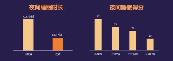 飲酒人群比不飲酒人群平均每晚少睡27分鐘。飲酒頻次越高,睡眠質量越低,每周飲酒大于7次的人群比從不飲酒人群,睡眠得分低4分。