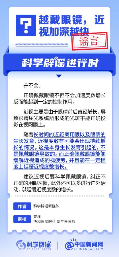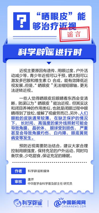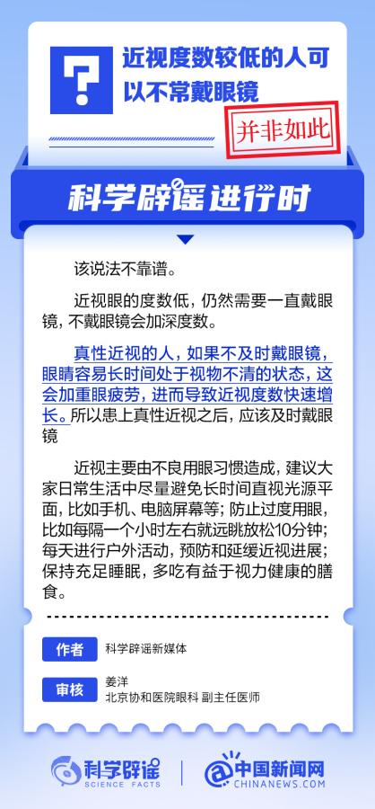中新網6月6日電 6月6日是全國愛眼日。隨著大家越來越重視護眼,人們開始自發地從網上查找一些護眼知識,與此同時,網上也出現了很多的護眼誤區。有哪些常見的所謂“護眼知識”其實是誤區?眼鏡度數配高點好還是配低點好?詳情↓ (來源:@科學辟謠 中國新聞網微博)