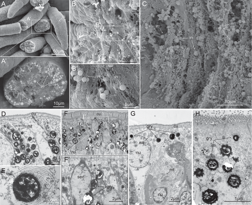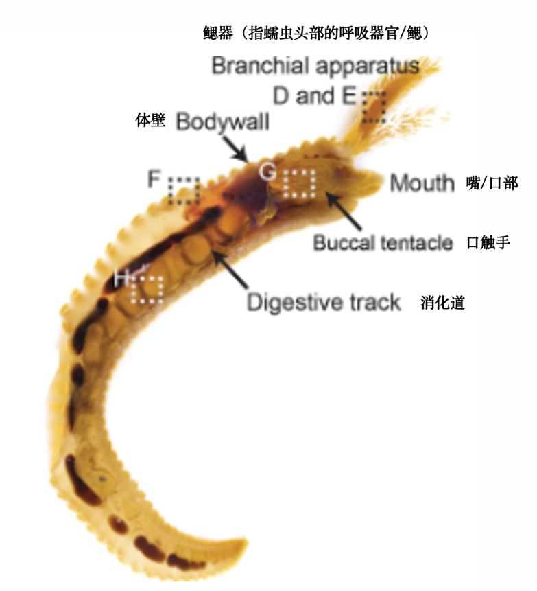 通過(guò)顯微鏡觀察,科學(xué)家發(fā)現(xiàn)蠕蟲(chóng)的上皮細(xì)胞中充滿(mǎn)了直徑0.77-1.29微米的黃色顆粒。這些顆粒不僅存在于體表,還分布在鰓、口觸手和消化道中——所有與海水直接接觸的部位。