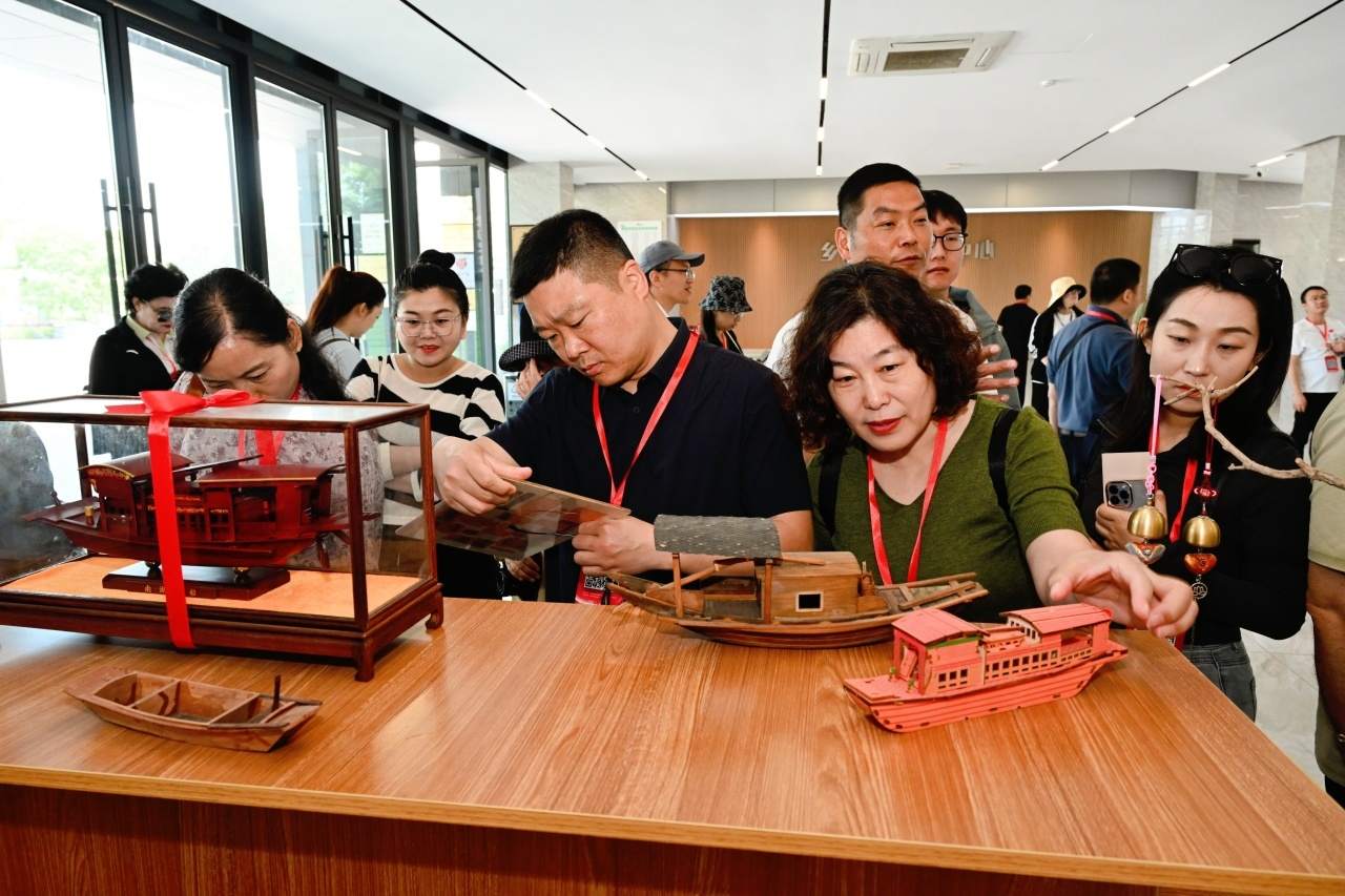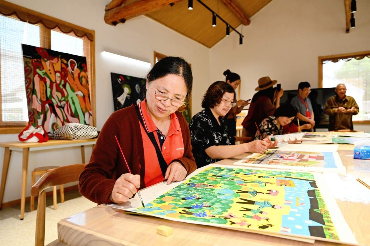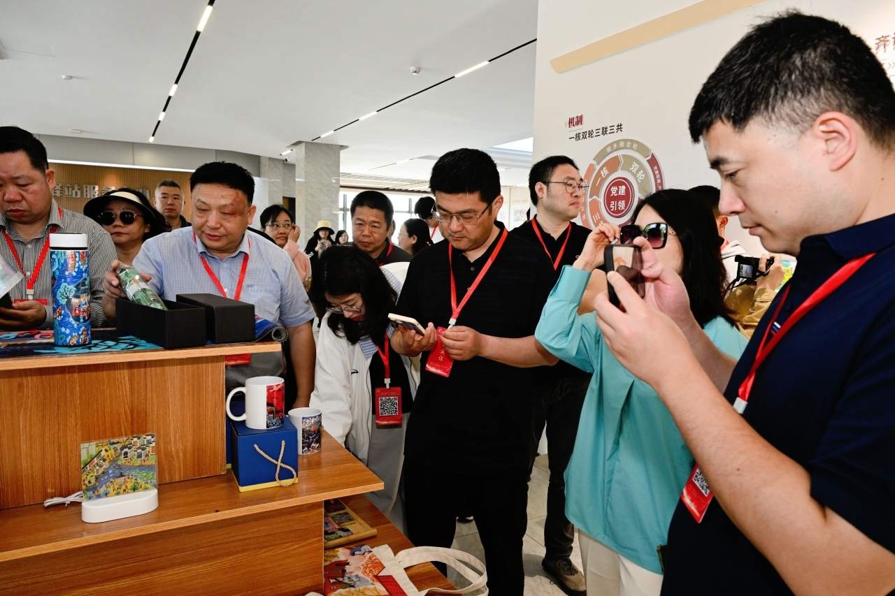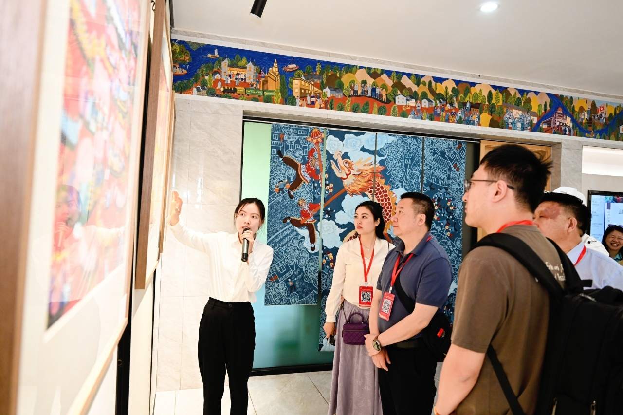 在農民畫藝術展示空間,記者們在村民的農民畫作品中感受到他們濃烈的幸福感與獲得感;“假日農民畫非遺課堂”、農民畫熱轉印體驗等一系列研學課程、體驗項目的開展,又讓大家真切體會到農民畫與產業的有機融合;一樓大廳“驛站”里,基于秀洲農民畫開發的各式文創產品令人忍不住就想“買買買”……