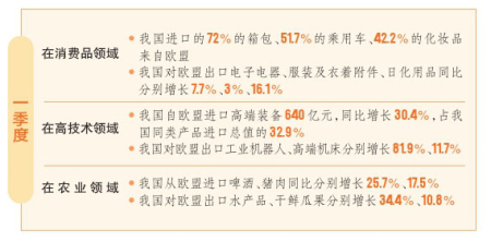 分領域看,在消費品領域,一季度,我國進口的72%的箱包、51.7%的乘用車、42.2%的化妝品來自歐盟,我國對歐盟出口電子電器、服裝及衣著附件、日化用品同比分別增長7.7%、3%、16.1%。