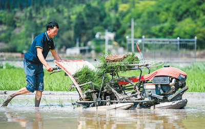 立夏過后,多地農民搶抓農時,陸續開展水稻插秧工作。圖為農機手操作插秧機在貴州省黔西南布依族苗族自治州安龍縣春潭街道阿興村進行插秧作業。據了解,當地近年來通過建設高標準農田,積極推廣多種農用機械,不斷夯實糧食生產基礎。劉朝富攝(人民視覺)