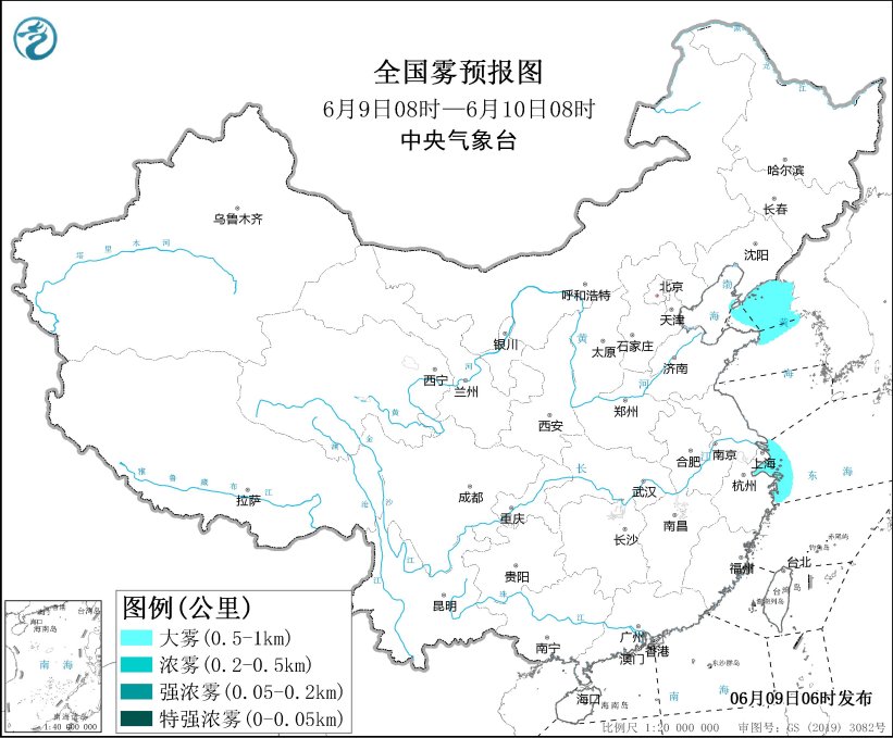 預計6月9日白天至夜間,渤海海峽、黃海北部海域、遼東半島東部沿岸海域、成山頭附近海域、長江口及杭州灣附近海域、舟山群島附近海域、大連港、上海港、寧波港將有能見度不足1公里的大霧。